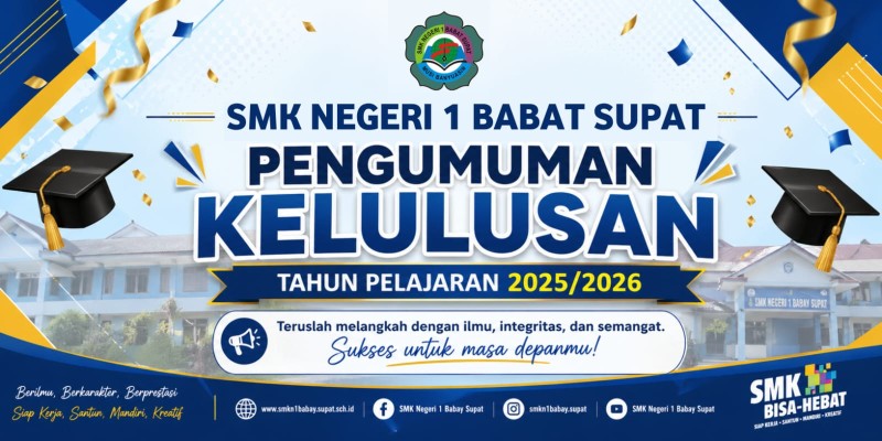 Untuk Semua Peserta Didik Kelas XII & XIII dapat mengakses Pengumumaan Kelulusan yang akan diumumkan pada Senin, 04 Mei 2026 melalui halaman Resmi Sistem Informasi Kelulusan SMKN 1 Babat Supat.